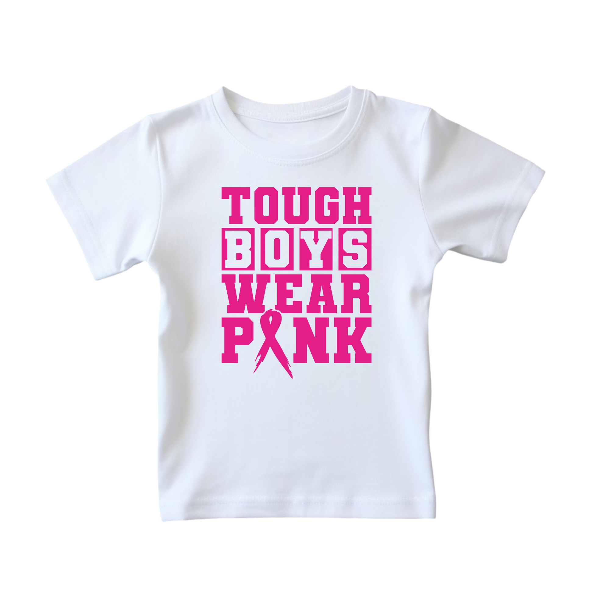 Get ready for Breast Cancer Awareness month with our In October We Wear Pink T-shirt! Made from 100% cotton, this kids' t-shirt features a bold pink design and the statement "Tough Boys Wear Pink" in heat transfer vinyl across the front. Show your support and make a stylish statement.