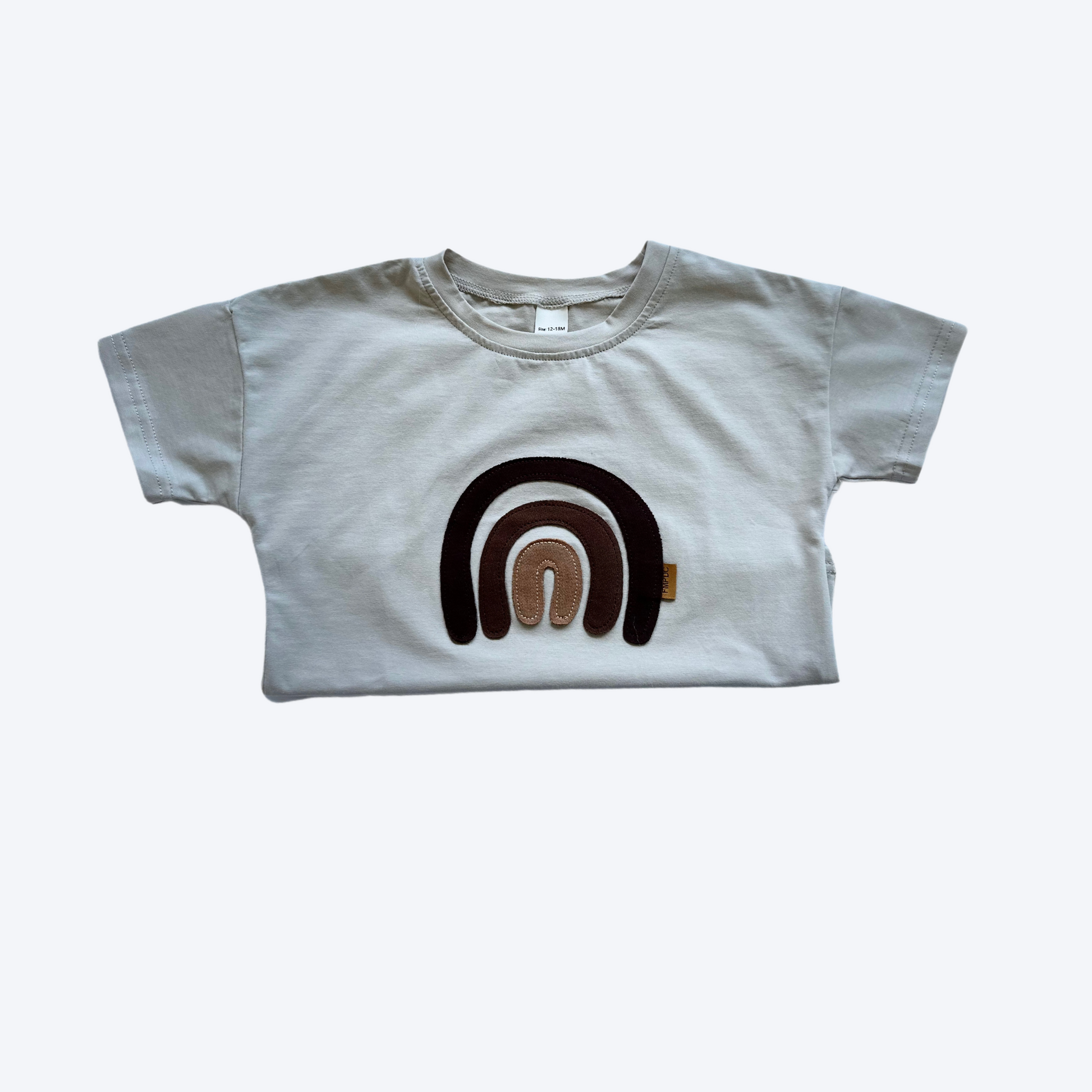 Unleash your toddlers inner rainbow with this brown rainbow shirt! Made from lightweight cotton, this light tan colored shirt will keep your little one cool and stylish all summer long. Embrace the warm shades of brown in a unique and playful way.