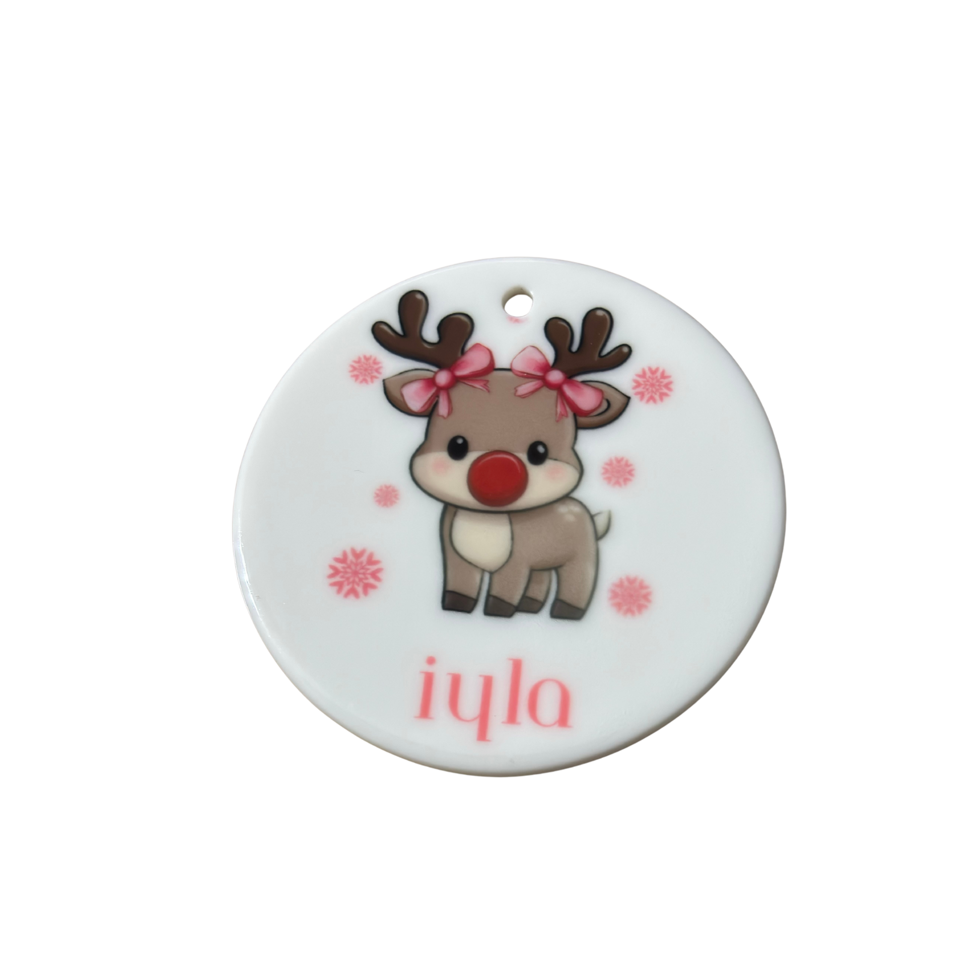 Celebrate the magic of the season with this charming personalized reindeer ornament! Crafted from durable ceramic, this festive keepsake features a delightful girl reindeer design that brings holiday cheer to any tree. Customize it with her name to create a one-of-a-kind treasure she'll treasure for years to come. Perfect for adding a personal touch to your Christmas décor or giving as a heartfelt gift that captures childhood wonder and seasonal joy.