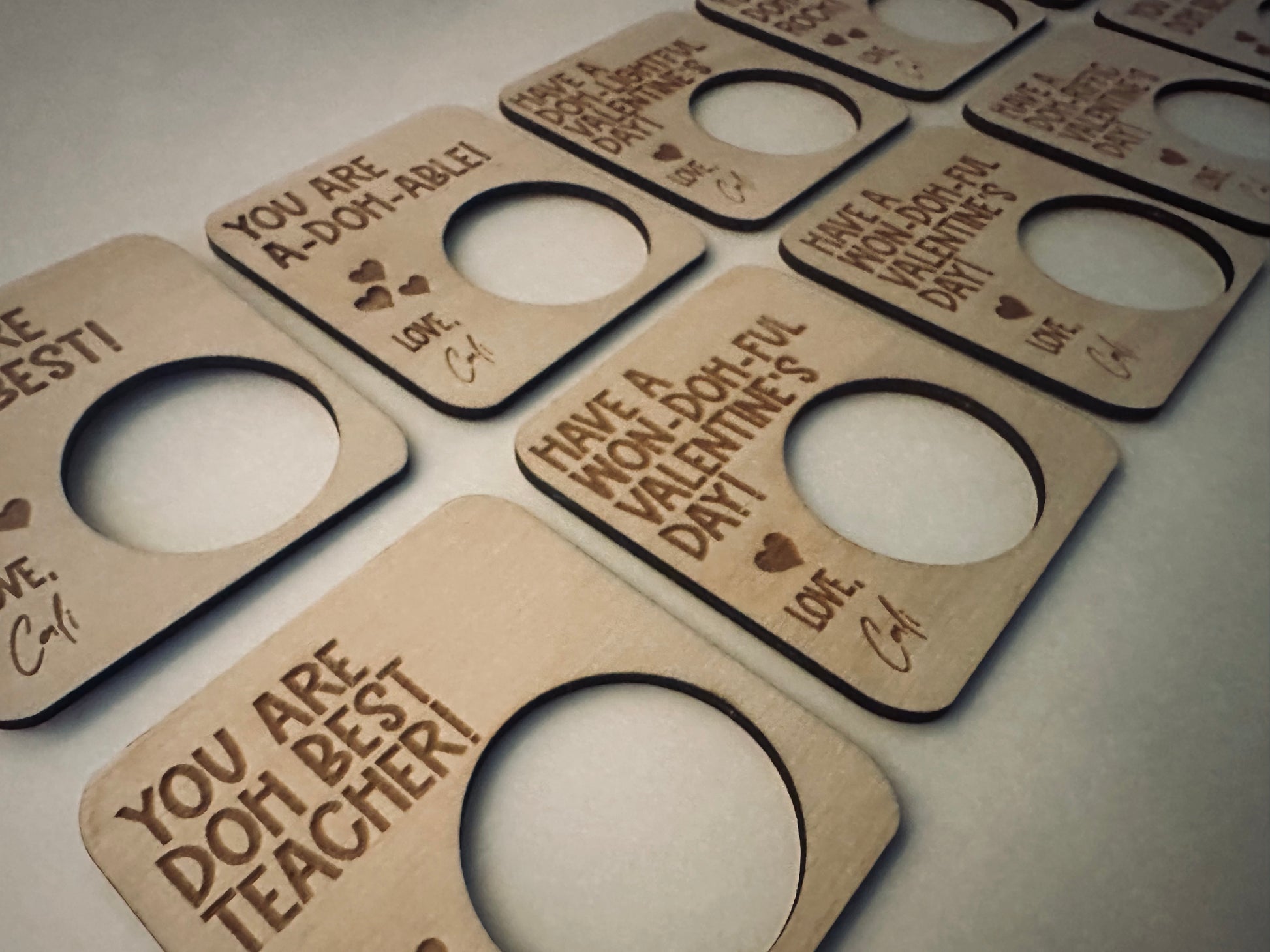Make this Valentine's Day special with our personalized Valentine's cards! Each card is laser engraved with a custom message and can fit a 1-2 ounce playdoh container. Made with high-quality wood, these 3 inch cards are the perfect way to show your love. Order now and make your loved one's day extra special!